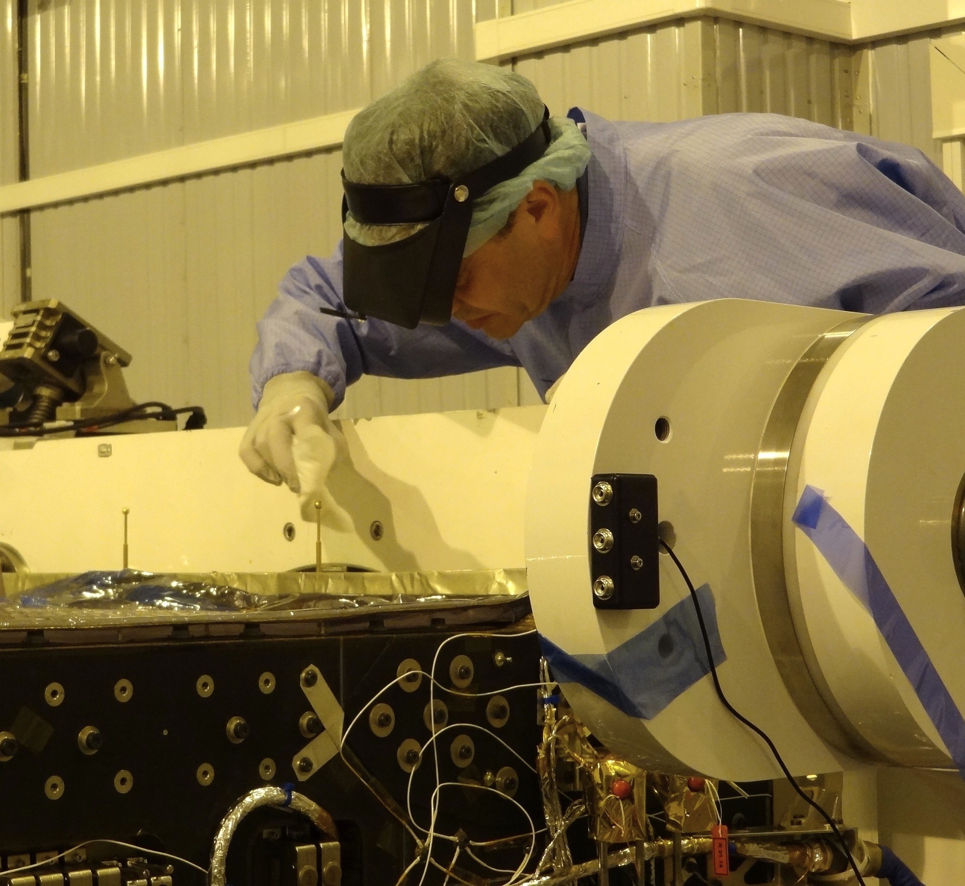 Swarm-satelliterna (Bild: ESA/AOES Medialab); Stephan Buchert, IRF Uppsala, rengör en guldbelagd Langmuir-sond en sista gång före uppskjutningen (Bild: Karim Bouridah, ESA)