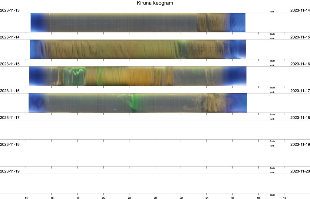 Bilden visar norrskensförekomsten över Kiruna från de senaste dagarna.